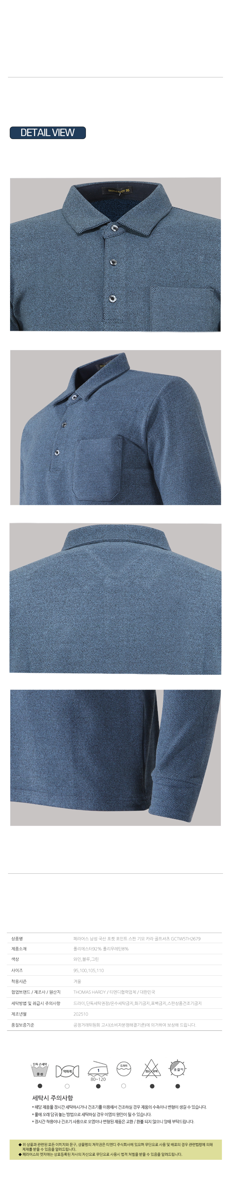 | 세탁방법 및 취급시 주의사항 | 드라이,단독세탁권장/온수세탁금지,화기금지,표백금지,스판상품건조기금지 |