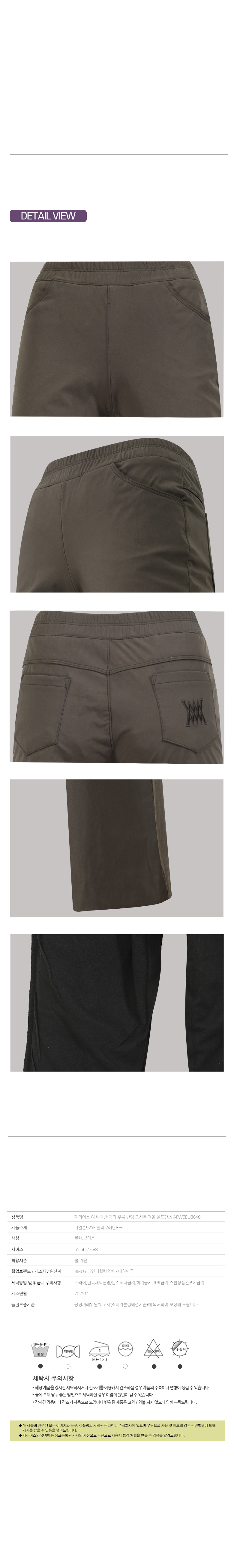 | 세탁방법 및 취급시 주의사항 | 드라이,단독세탁권장/온수세탁금지,화기금지,표백금지,스판상품건조기금지 |