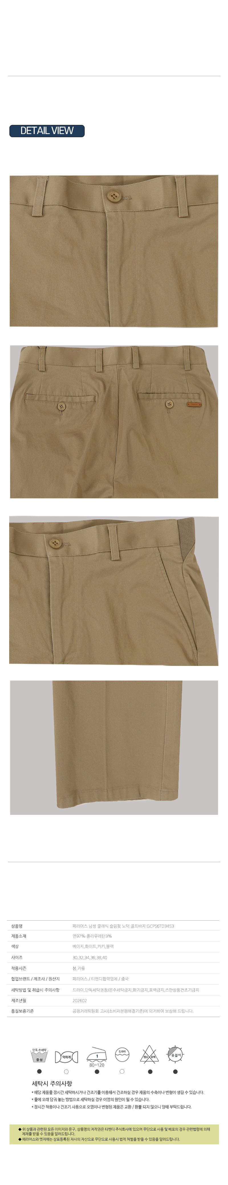 | 세탁방법 및 취급시 주의사항 | 드라이,단독세탁권장/온수세탁금지,화기금지,표백금지,스판상품건조기금지 |