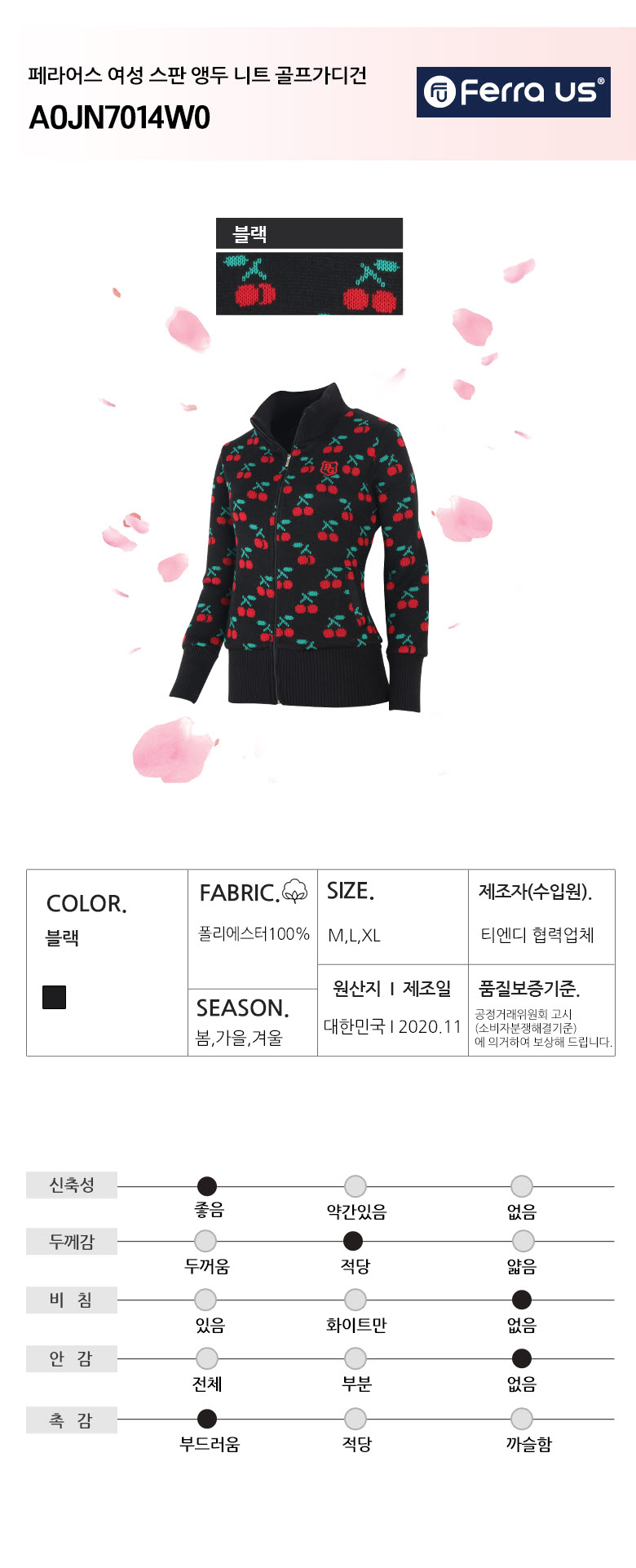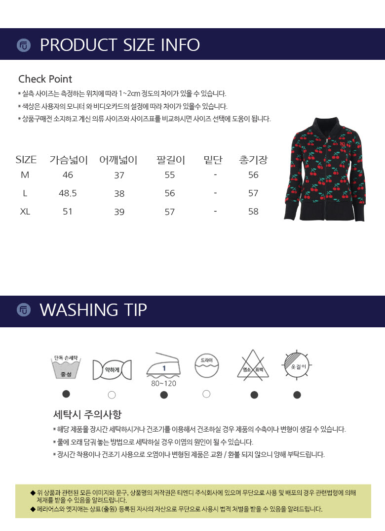 | 세탁방법 및 취급시 주의사항 | 단독세탁권장/온수세탁금지,화기금지,표백금지,스판상품건조기금지 |