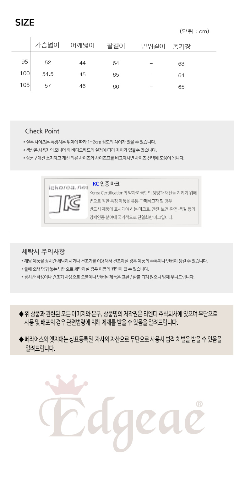 세탁방법 및 취급시 주의사항 | 드라이,단독세탁권장/온수세탁금지,화기금지,표백금지,스판상품건조기금지 |