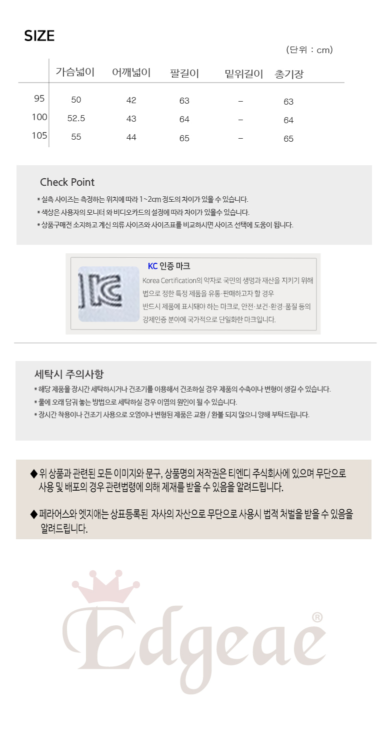 세탁방법 및 취급시 주의사항 | 드라이,단독세탁권장/온수세탁금지,화기금지,표백금지,스판상품건조기금지 |