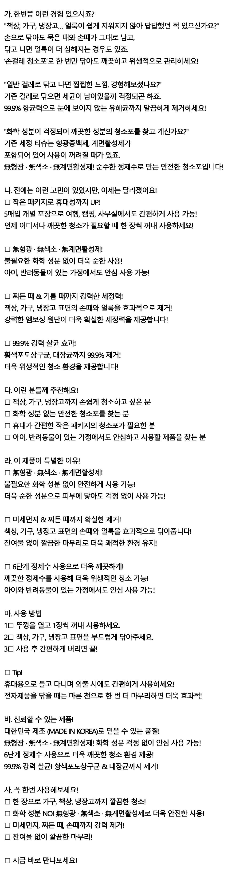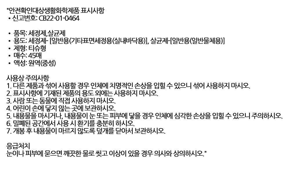 순수한 정제수로 만든 안전한 손걸레 청소포 45매입