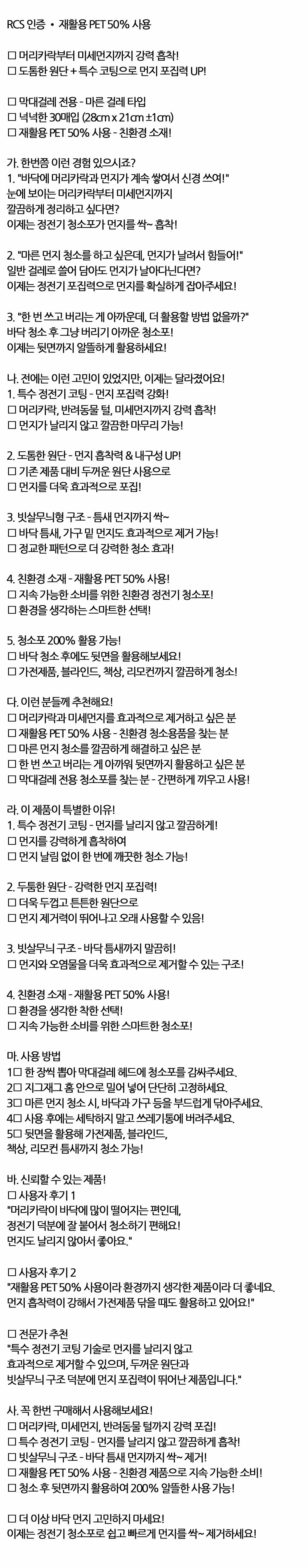 머리카락 반려동물 털 강력 흡착 정전기청소포 30매