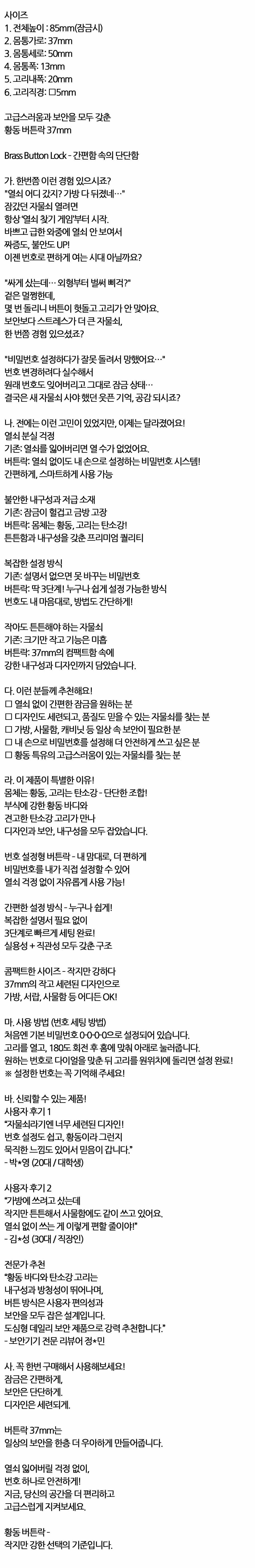 열쇠 없이 내 손으로 설정하는 황동 버튼 자물쇠 37mm