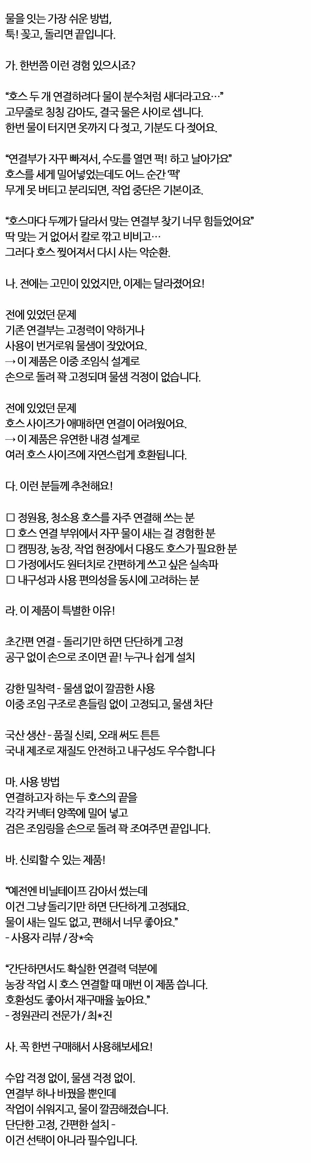호스 두 개를 간편하게 연결해주는 조임식 호스커넥터