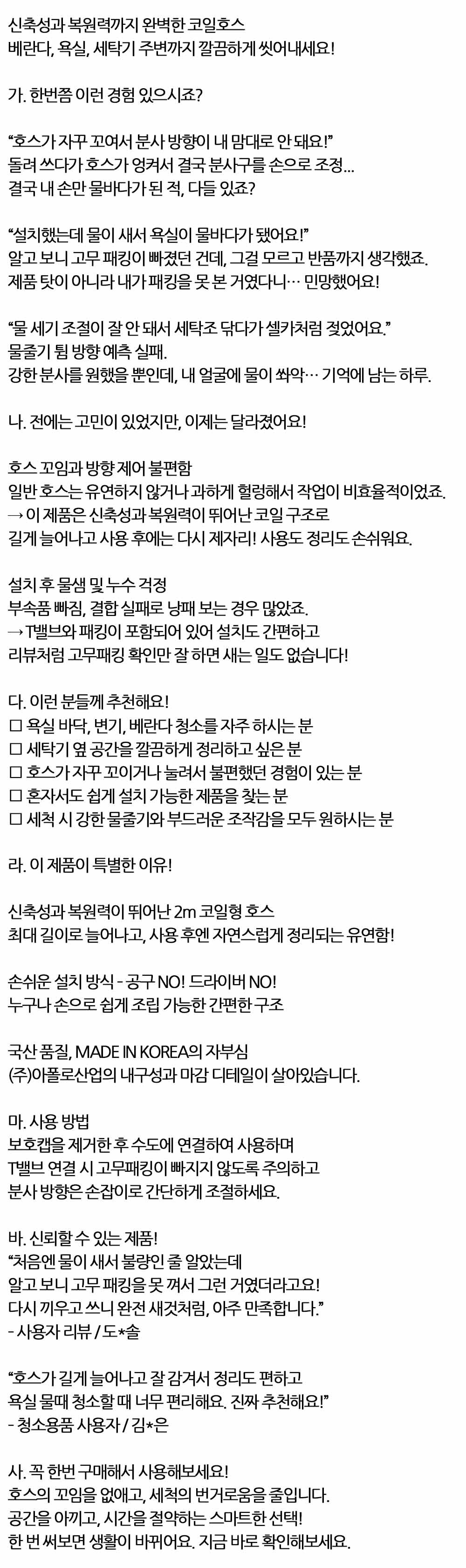 베란다 욕실 세탁기 주변 씻어내세요 코일호스세트 2M