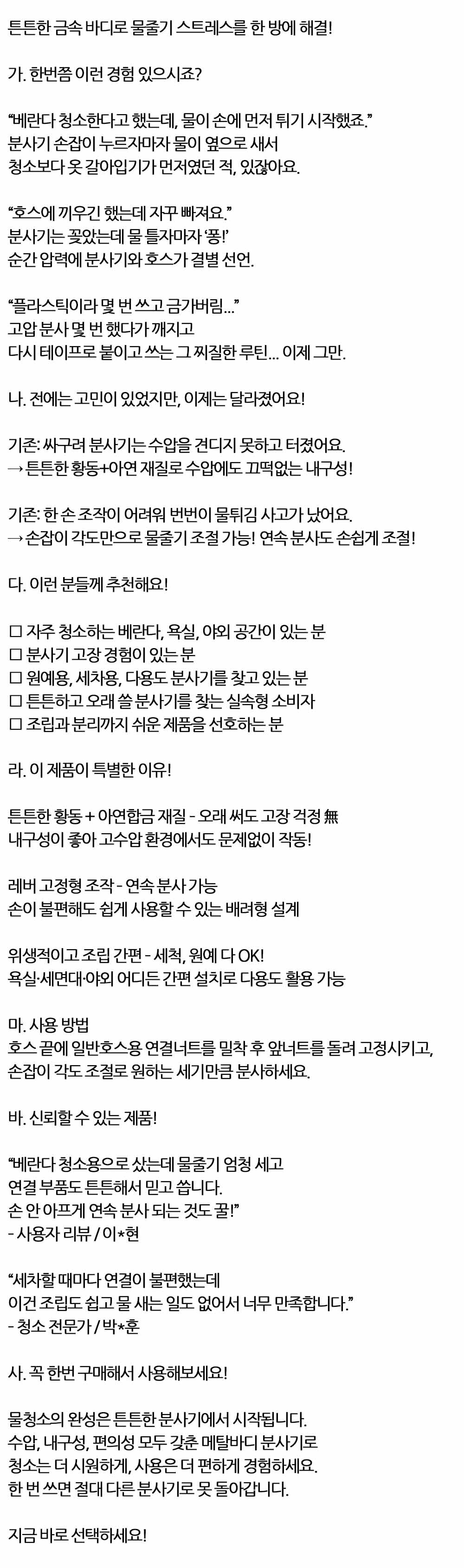튼튼한 황동 아연 재질 수압에도 끄떡없는 메탈분사기