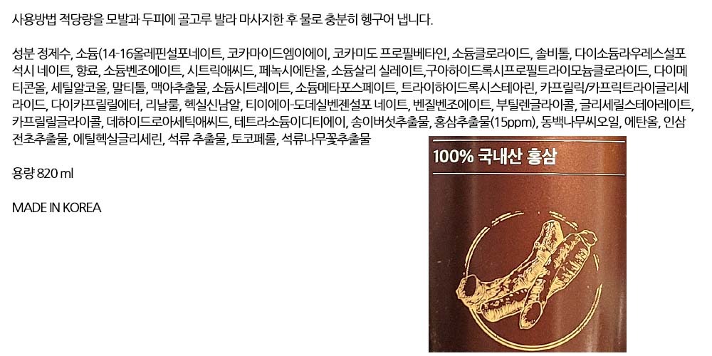 국내산 홍삼 진한 영양 중건성 두피용 헤어샴푸 820ml
