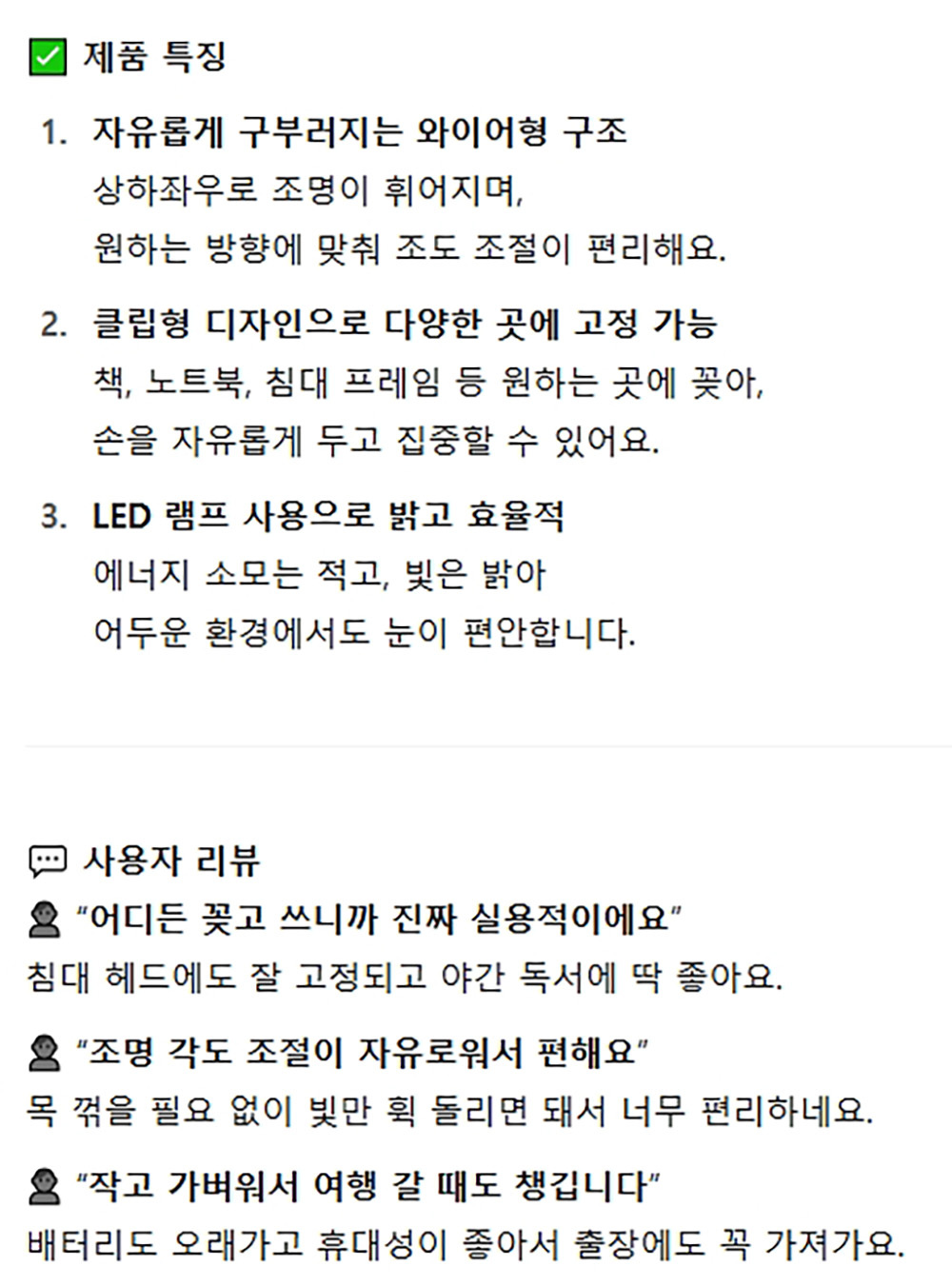 자유롭게 구부러지는 와이어형 구조 독서 북라이트