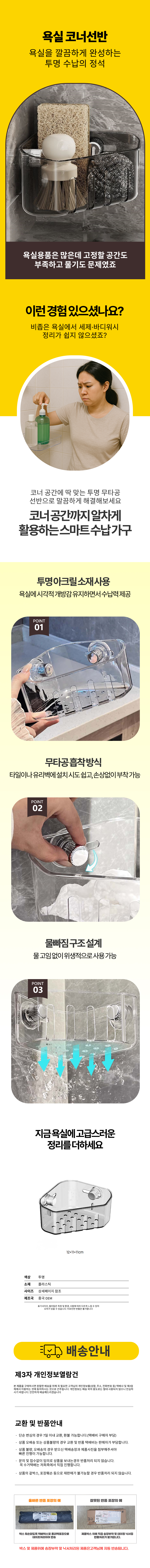 욕실정리 투명 수납함 코너선반 무타공 물빠짐 아크릴