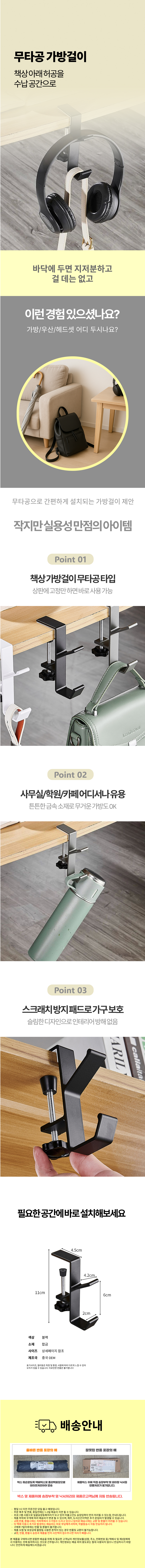 좁은공간 활용 스틸 고리 후크 무타공 책상 가방걸이