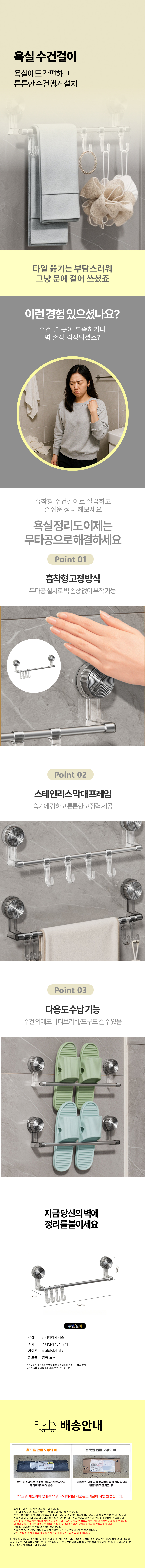 욕실 수납 선반 벽면설치 무타공 흡착식 수건 걸이