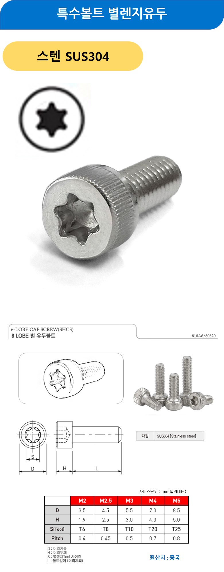 특수볼트 별렌치유두 스텐 M5x25mm 50개