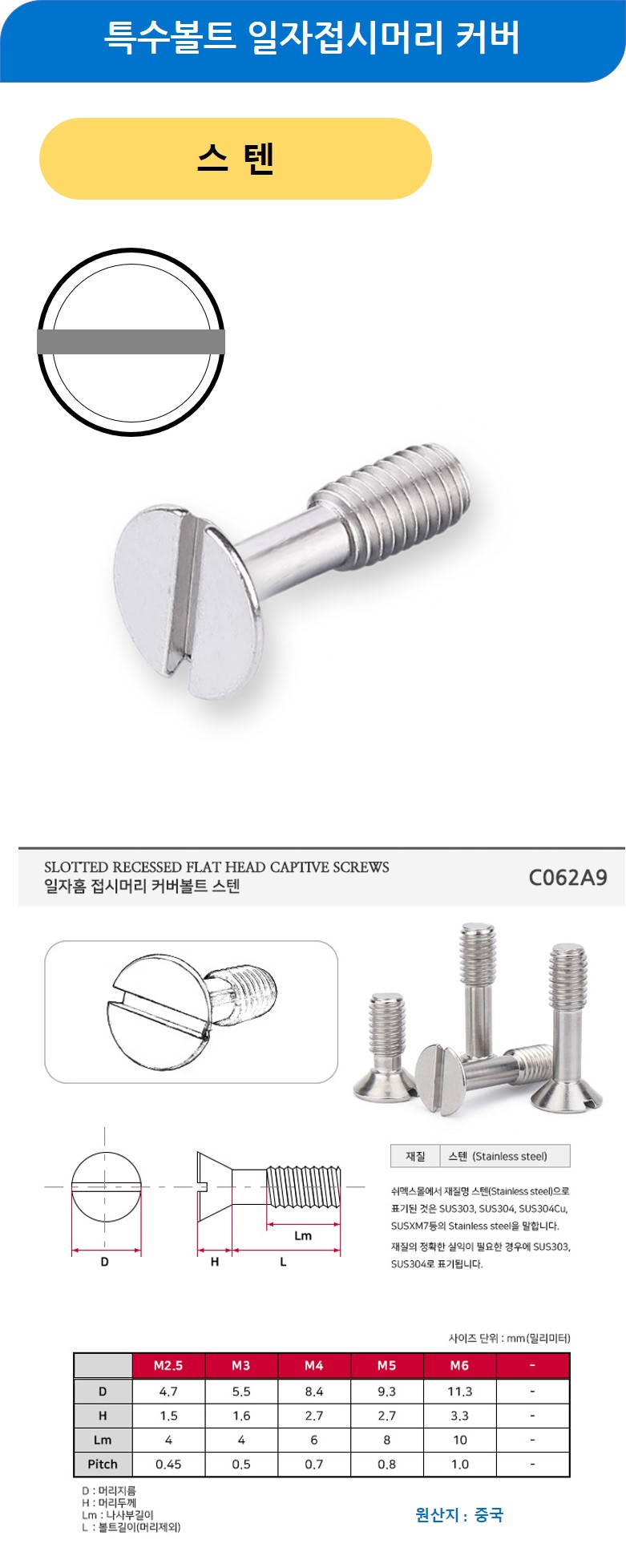 특수볼트 일자접시머리 커버 스텐 M3x20mm 40개