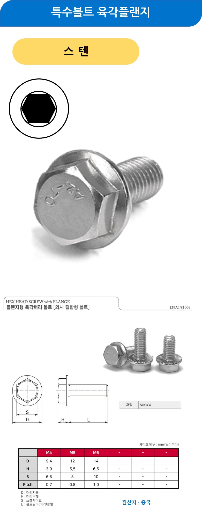 특수볼트 육각플랜지 스텐 M5x12mm 100개