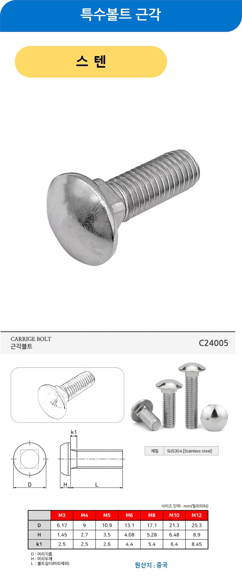 특수볼트 근각 스텐 M3x12mm 500개