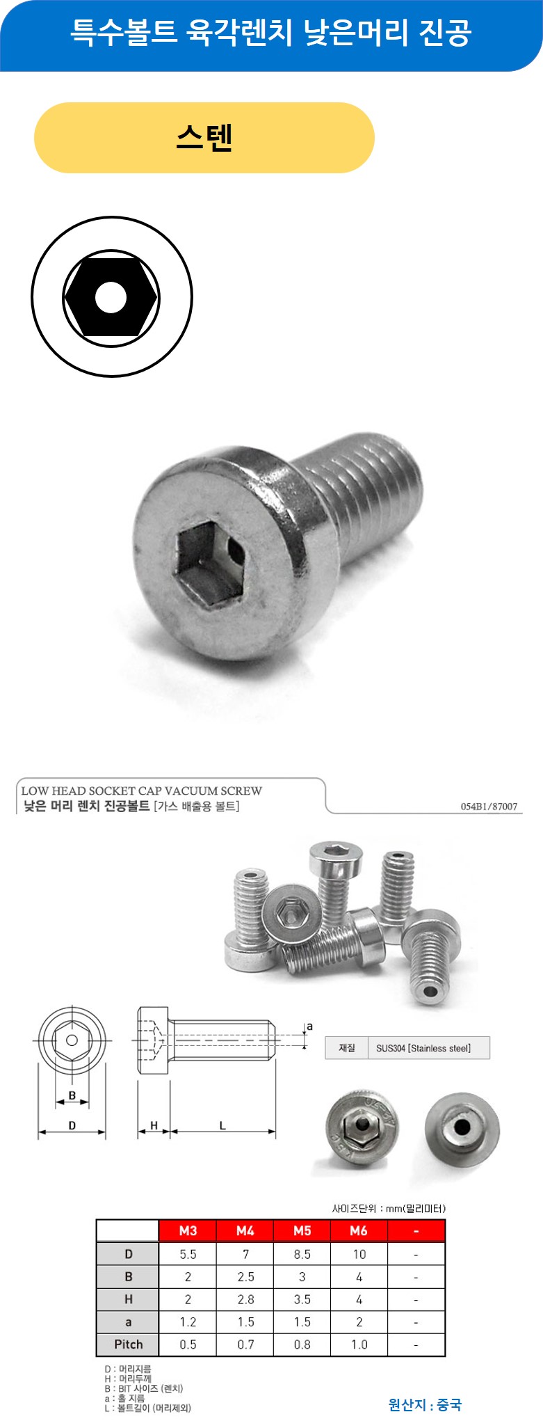 특수볼트 진공 육각렌치 낮은머리 스텐 M3x8mm 20개