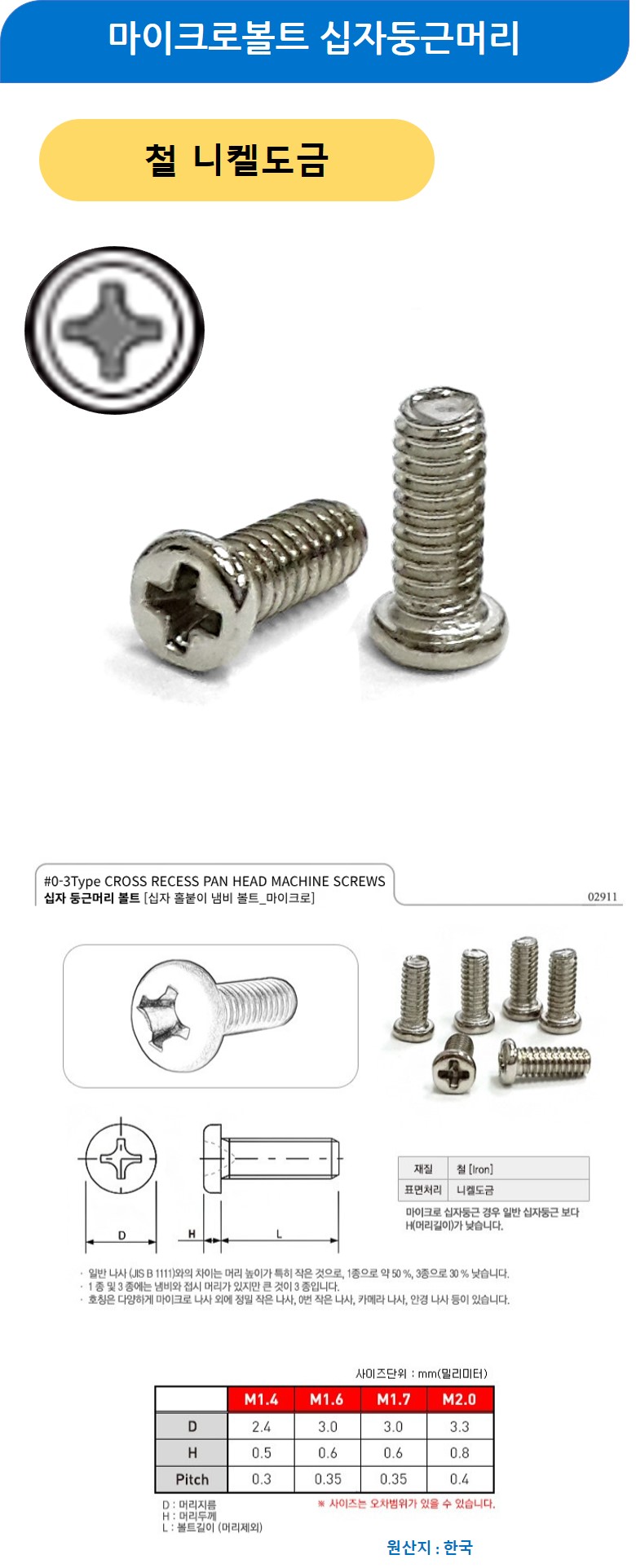 마이크로볼트 십자둥근머리 철니켈도금 M2x6mm 5000개