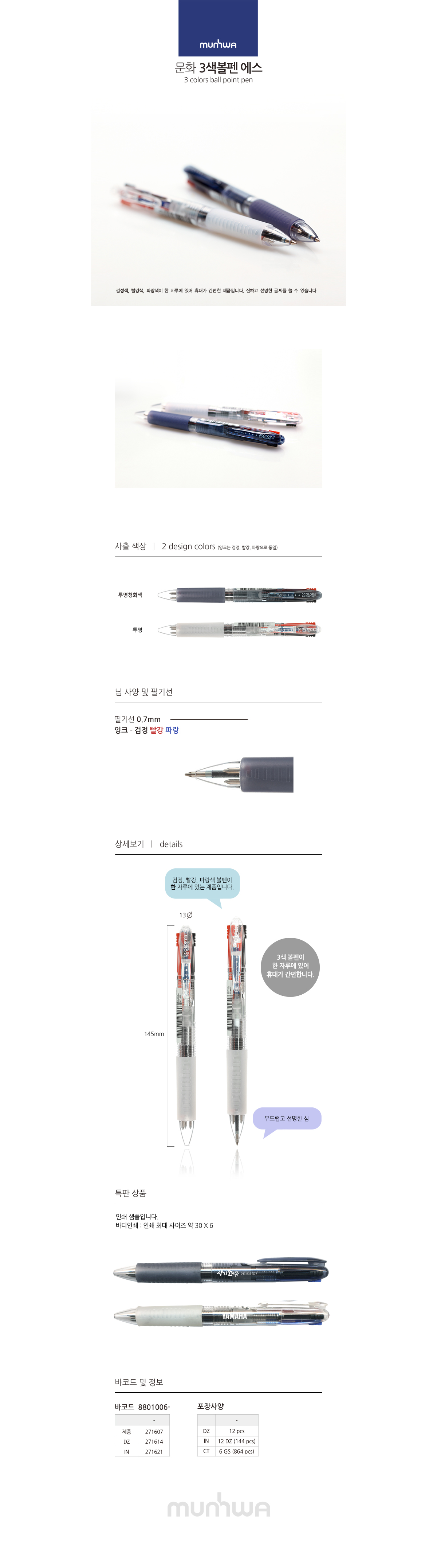 문화연필 3색볼펜 S 에스 0.7 S-3 유성펜