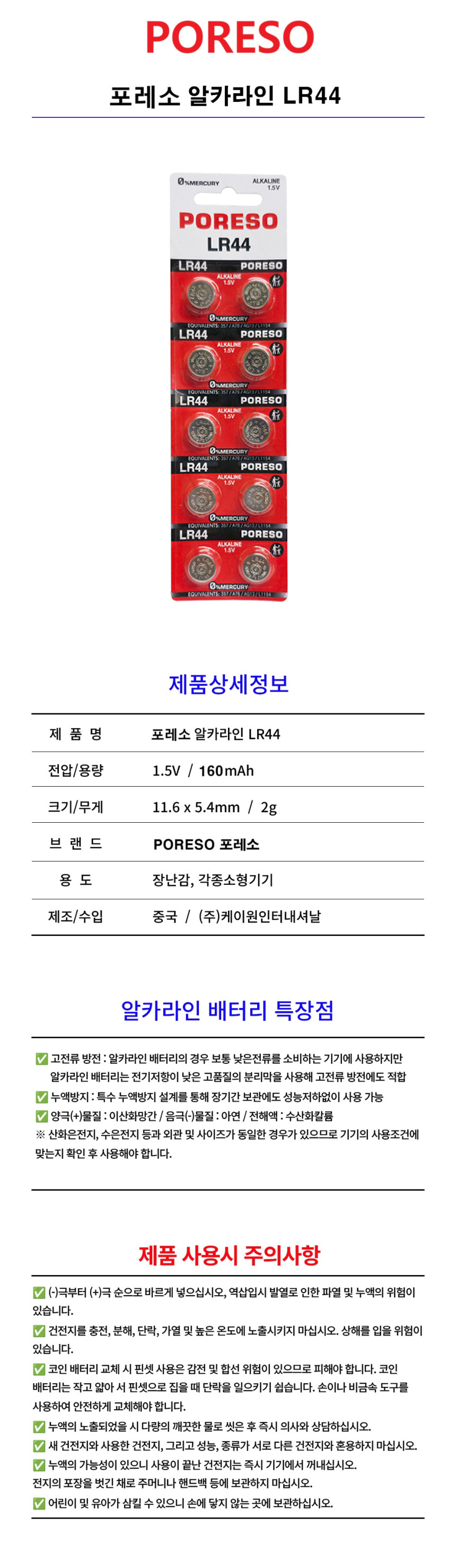포레소 알카라인 1.5V 리튬건전지 수은건전지 LR44 2