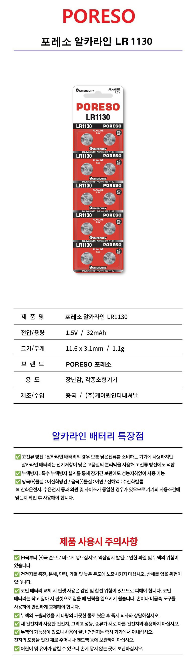 포레소 리튬건전지 수은건전지 (LR1130)(1.5V) 2개입