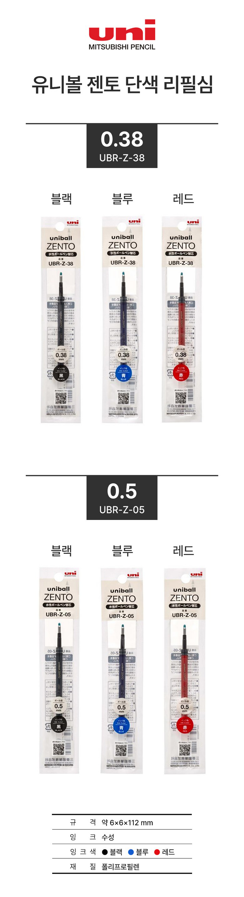 (유니) 유니볼 젠토 수성볼펜 리필심 UBR-Z-38 (흑색-