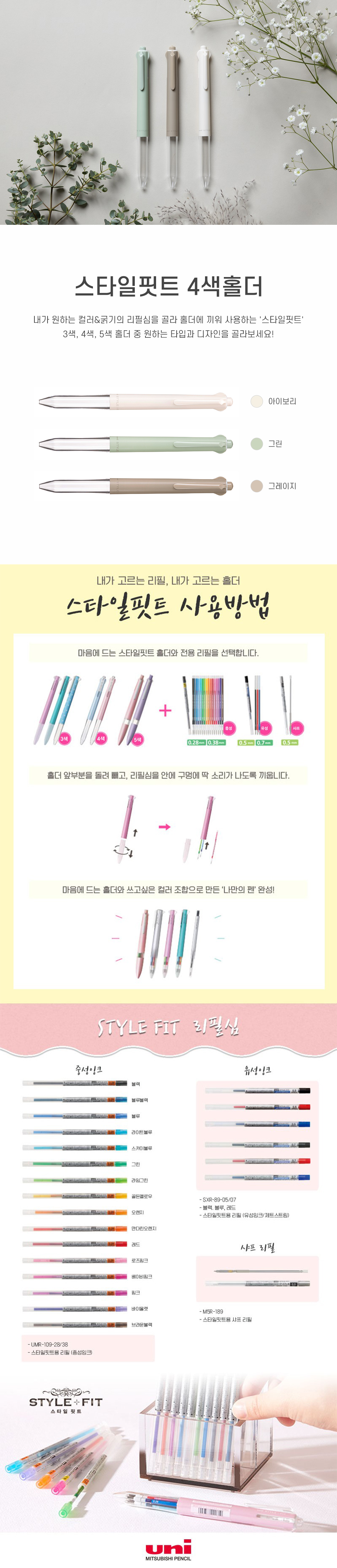 유니 스타일핏트 4색홀더 UE4H-227 그린 / 리필심별매