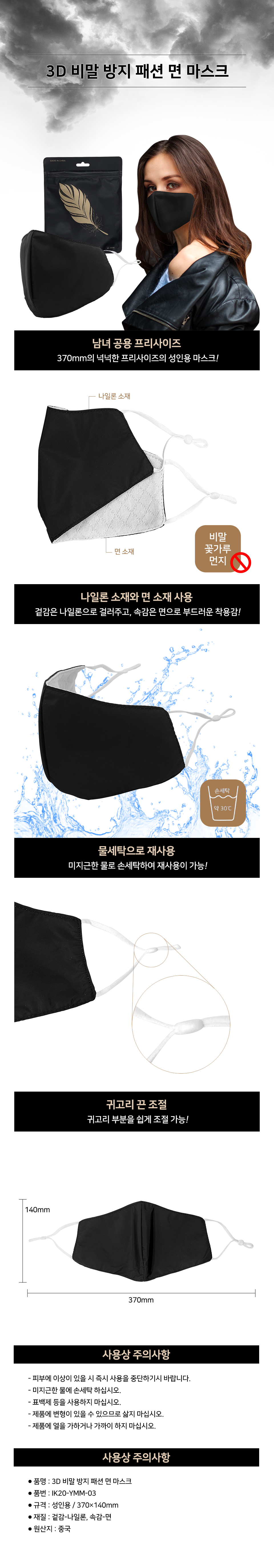 쓰기편한 면마스크 고급 LS-B006 블랙 / 귀끈조절가능