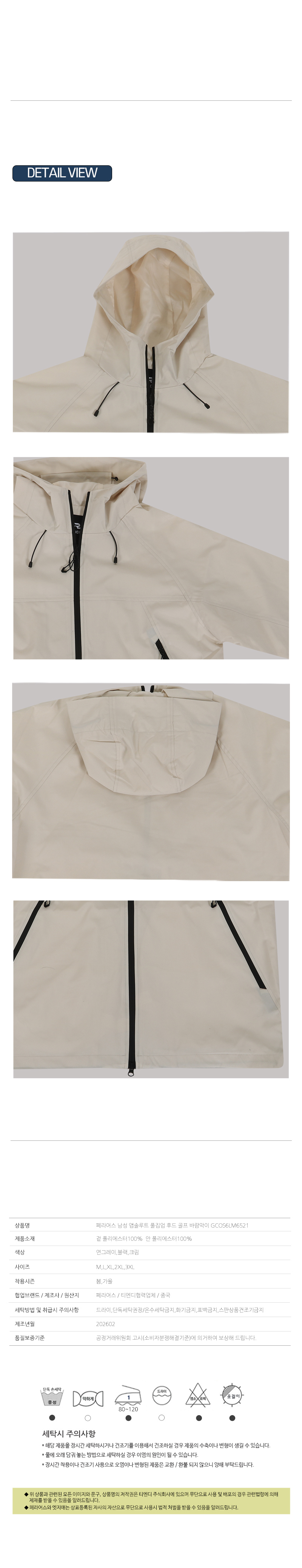 | 세탁방법 및 취급시 주의사항 | 드라이,단독세탁권장/온수세탁금지,화기금지,표백금지,스판상품건조기금지 |