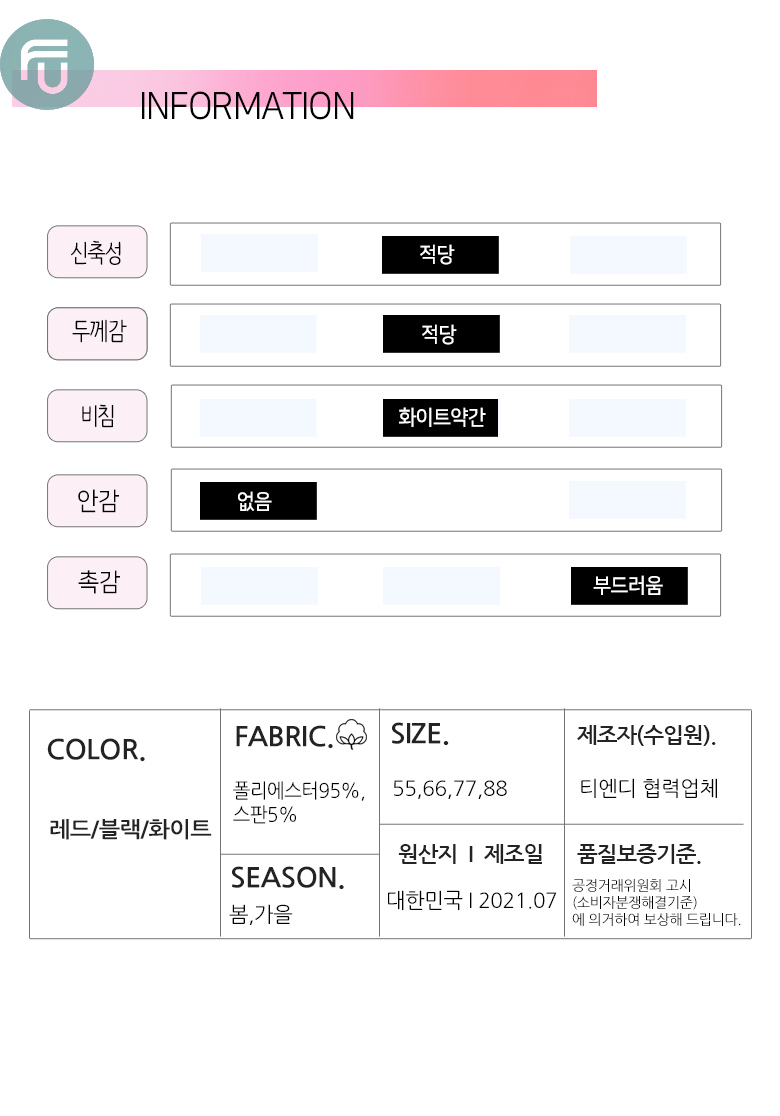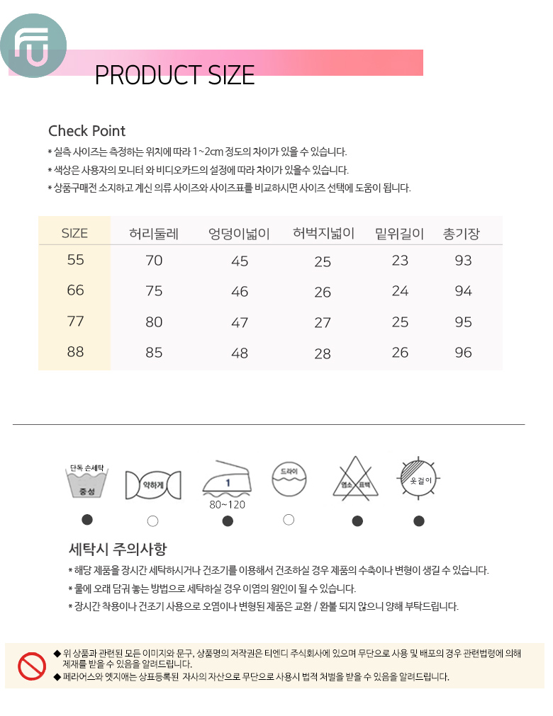 | 세탁방법 및 취급시 주의사항 | 드라이,단독세탁권장/온수세탁금지,화기금지,표백금지,스판상품건조기금지 |