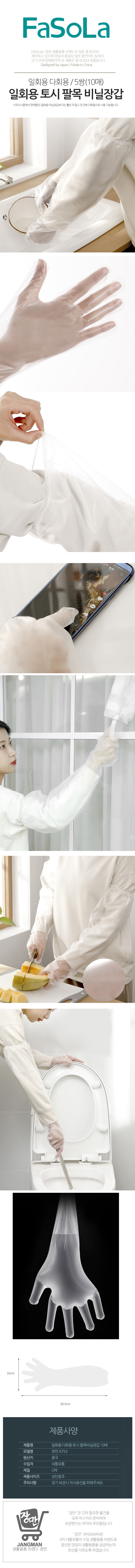 | 모델명 | 장만A753 일회용 다회용 토시 팔목 비닐장갑 10매 작업용 청소용 |