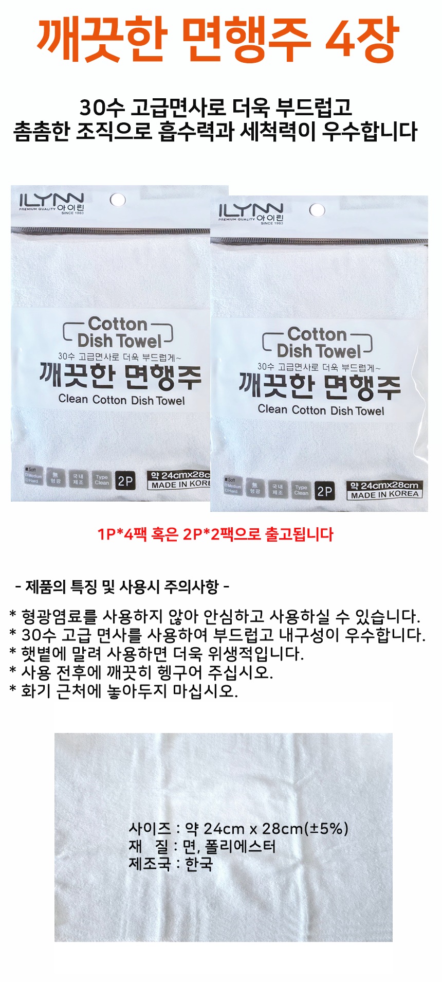 아이린 깨끗한 면행주 4장 화이트 주방행주 위생행주