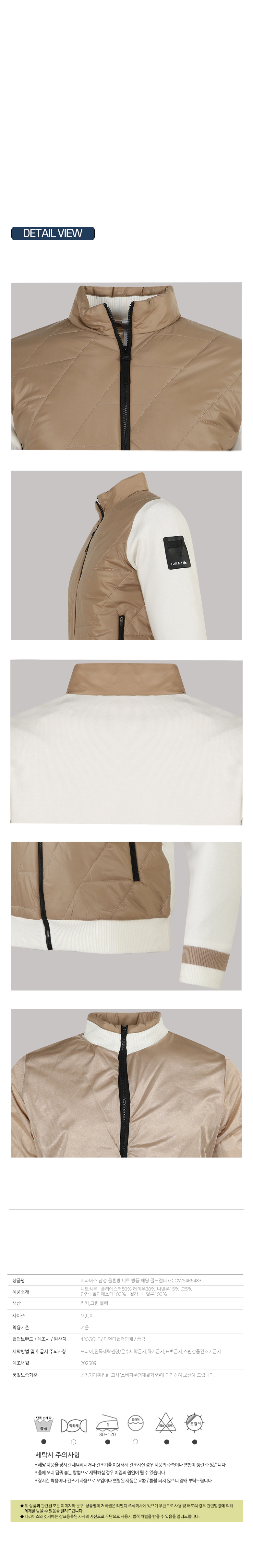 | 제품소재 | 니트성분 : 폴리에스터50% 레이온30% 나일론15% 모5% 안감 : 폴리에스터100% 겉감 : 나일론100% |