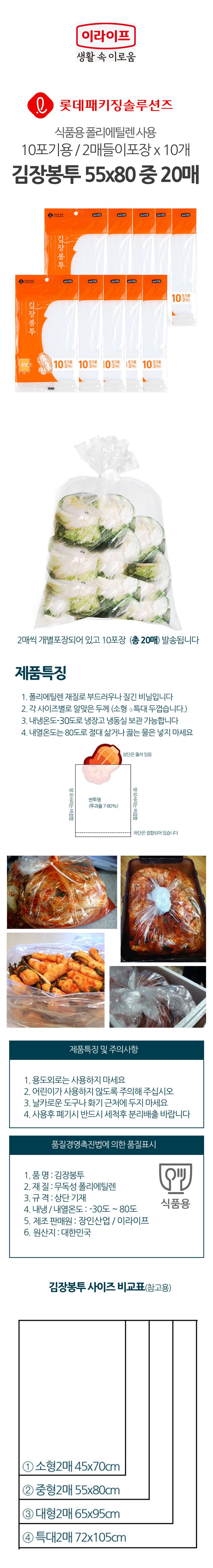 | 모델명 | 롯데이라이프 김장봉투 55x80 중형 20매 배추10포기 질긴비닐 김장비닐봉투 |