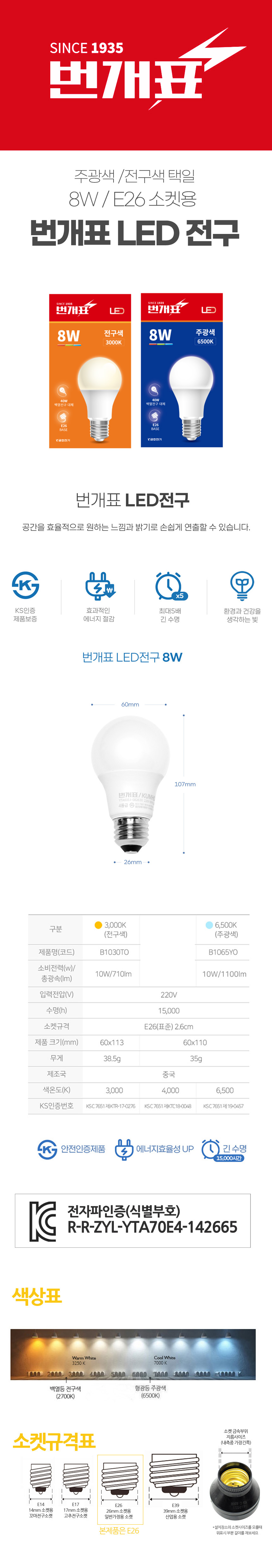 | 모델명 | 번개표 LED전구 8W 주광색 전구색 전등 LED램프 전구다마 백열등 |