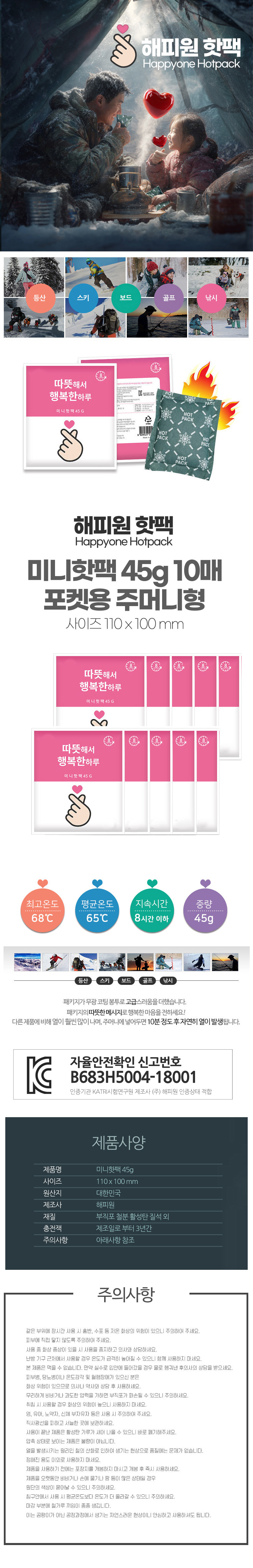 | 모델명 | 해피원 핫팩 45g 10개 미니 주머니핫팩 포켓용핫팩 8시간지속 손난로 주머니난로 |