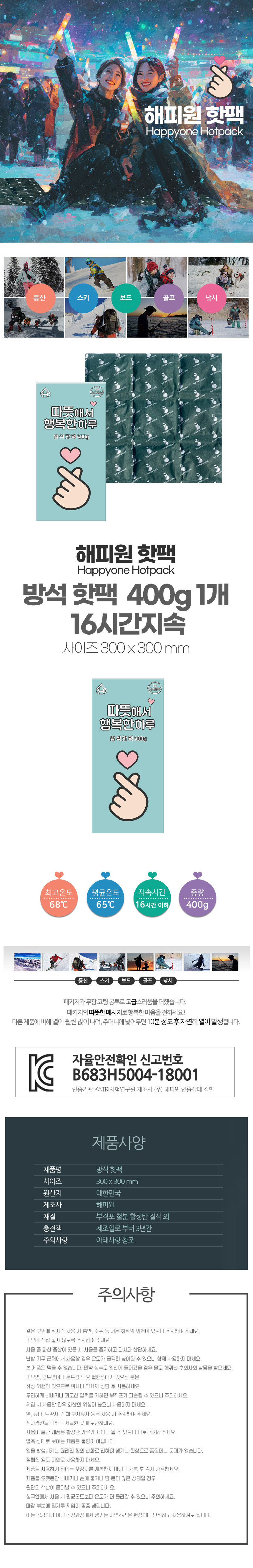 | 모델명 | 해피원 방석 핫팩 1개 30cm 깔판 야외행사 400g 16시간지속 야간근무 |