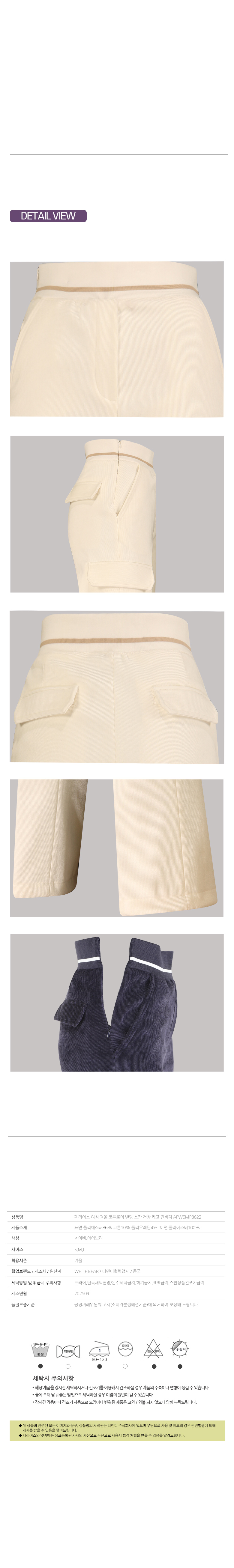 | 세탁방법 및 취급시 주의사항 | 드라이,단독세탁권장/온수세탁금지,화기금지,표백금지,스판상품건조기금지 |